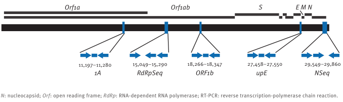 ORF1ab/RdRP(2798bp)、Gene N(1242bp)、uPE/E(996bp) |