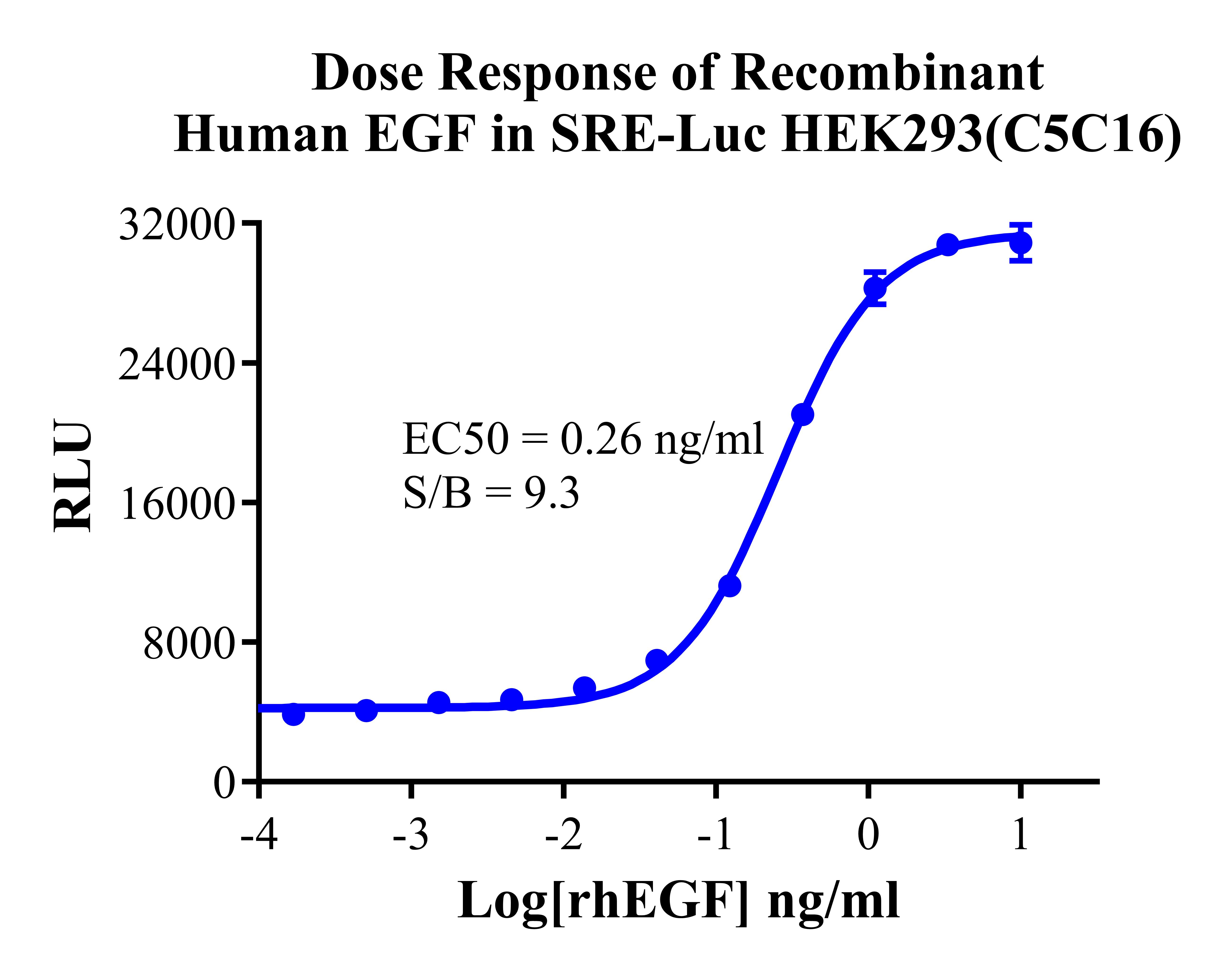 Figure 2. Detect Luciferase assay by Ultra Luciferase Detection Kit CBPH0001(we strongly suggest to purchase from Cobioer). Dose Response of Recombinant Human EGF in SRE-Luc HEK293 Cells (C5C16). |