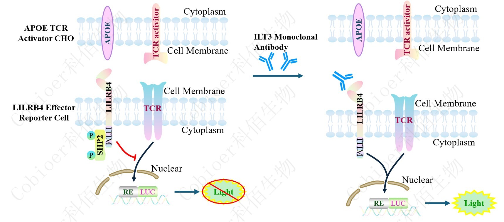 APOE TCR Activator CHO 作為 LILRB4 Effector Reporter Cell 的靶細(xì)胞,很好的模擬了 體內(nèi) LILRB4 的信號(hào)轉(zhuǎn)導(dǎo)過程,原理見下圖所示。![]() Figure 1. APOE TCR Activator CHO 模型原理圖 |