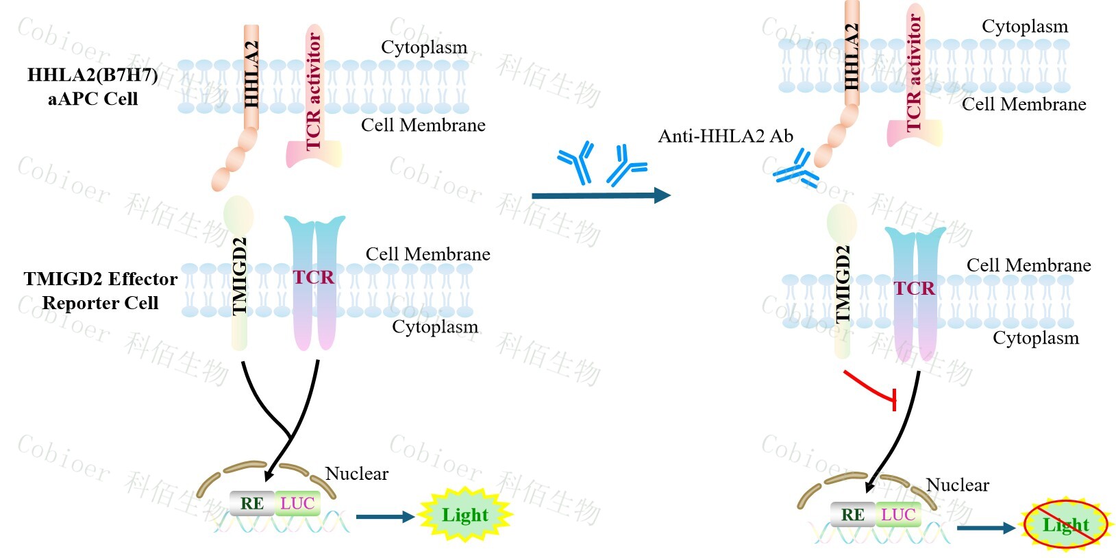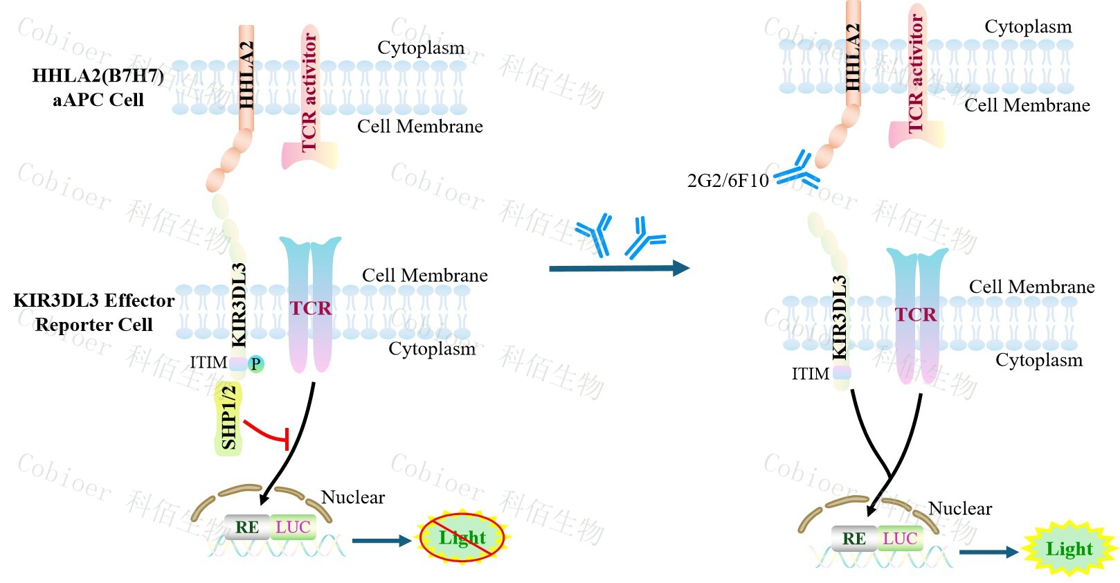 HHLA2(B7H7) aAPC Cell 作 為 KIR3DL3 Effector Reporter Cell 或 TMIGD2 Effector Reporter Cell 的 靶 細(xì) 胞 , 很好的模擬了體內(nèi) KIR3DL3/ HHLA2(B7H7) 或TMIGD2/HHLA2(B7H7)的信號(hào)轉(zhuǎn)導(dǎo)過程,原理見下圖所示。![]() ![]() Figure 1. HHLA2(B7H7) aAPC Cell 細(xì)胞模型原理圖 |