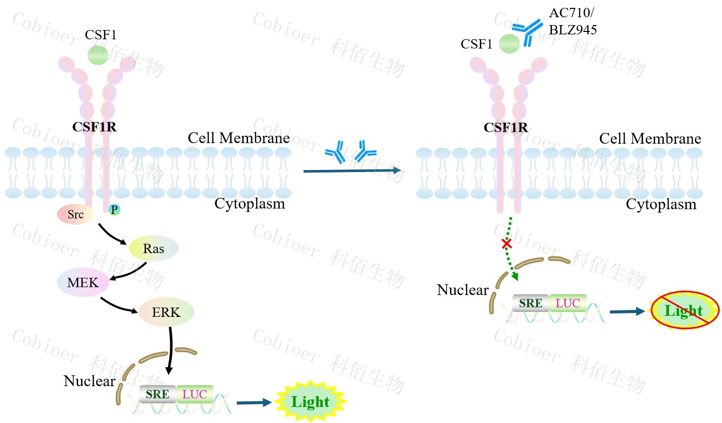 CSF1R SRE-Luc HEK293 報告基因藥靶模型很好的模擬了體內(nèi) CSF1 的信號轉(zhuǎn)導過程, 原理見下圖所示。