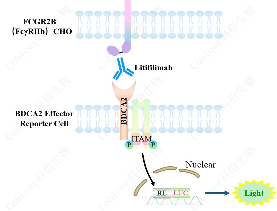 BDCA2 Effector Reporter 報(bào)告基因藥靶模型很好的模擬了體內(nèi) BDCA2 的信號轉(zhuǎn)導(dǎo)過程, 原理見下圖 所示。![]() Figure 1. BDCA2 Effector Reporter 細(xì)胞模型原理圖
