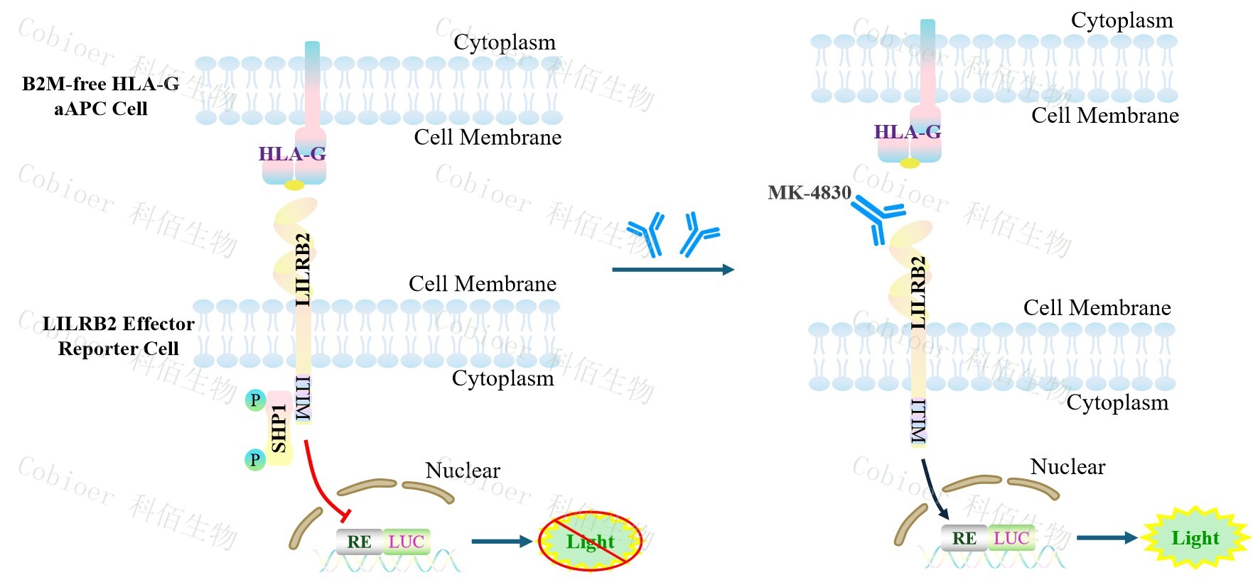 B2M-free HLA-G aAPC Cell 作為 LILRB2 Effector Reporter Cell 的靶細胞,很好的模擬 了體內(nèi) LILRB2 的信號轉(zhuǎn)導過程,原理見下圖所示。![]() Figure 1. B2M-free HLA-G aAPC Cell 模型原理圖 |
