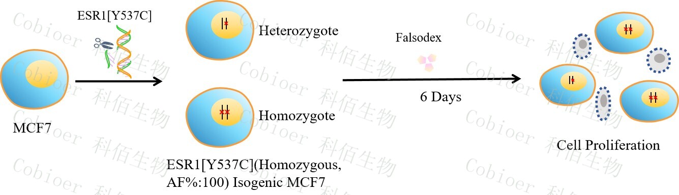 ESR1[Y537C](Homozygous,AF%:100) Isogenic MCF7 藥靶細胞,通過基因編輯的方式將 ESR1 的 537 位氨基酸酪氨酸(Y)突變?yōu)榘腚装彼幔–)。![]() Figure 1. ESR1[Y537C](Homozygous,AF%:100) Isogenic MCF7 原理示意圖 |