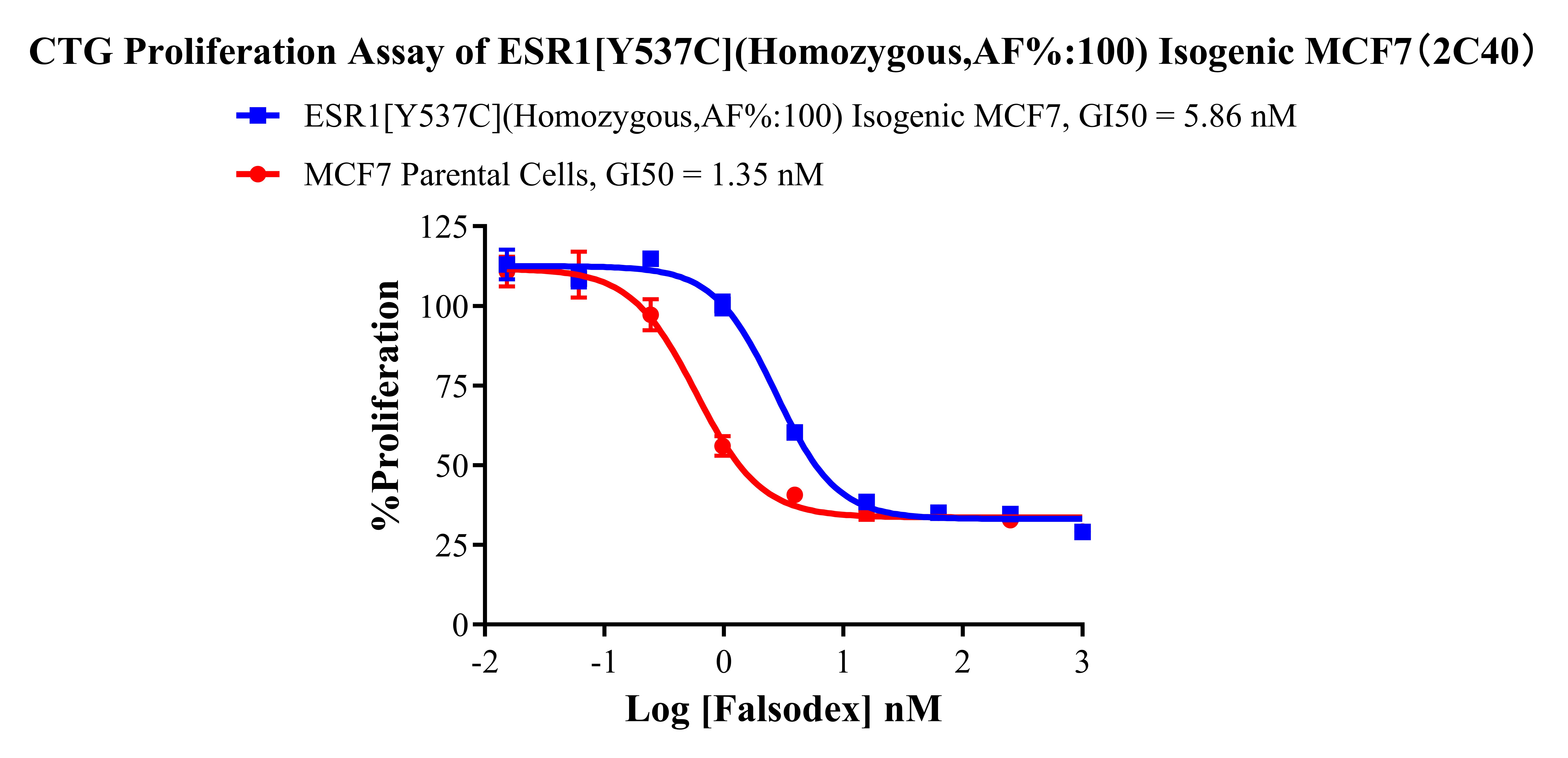 ![]() Figure 2. Sanger of ESR1[Y537C](Homozygous,AF%:100) Isogenic MCF7. ![]() Figure 3. A: MCF7 Parental Cell;B:ESR1[Y537C](Homozygous,AF%:100) Isogenic MCF7 通道2 藍色微滴代表ESR1[Y537C]突變陽性,通道2 綠色微滴代表該位點為陰性野生型 ![]() Figure 4. CTG Proliferation Assay of ESR1[Y537C](Homozygous,AF%:100) lsogenic MCF7(2C40). |