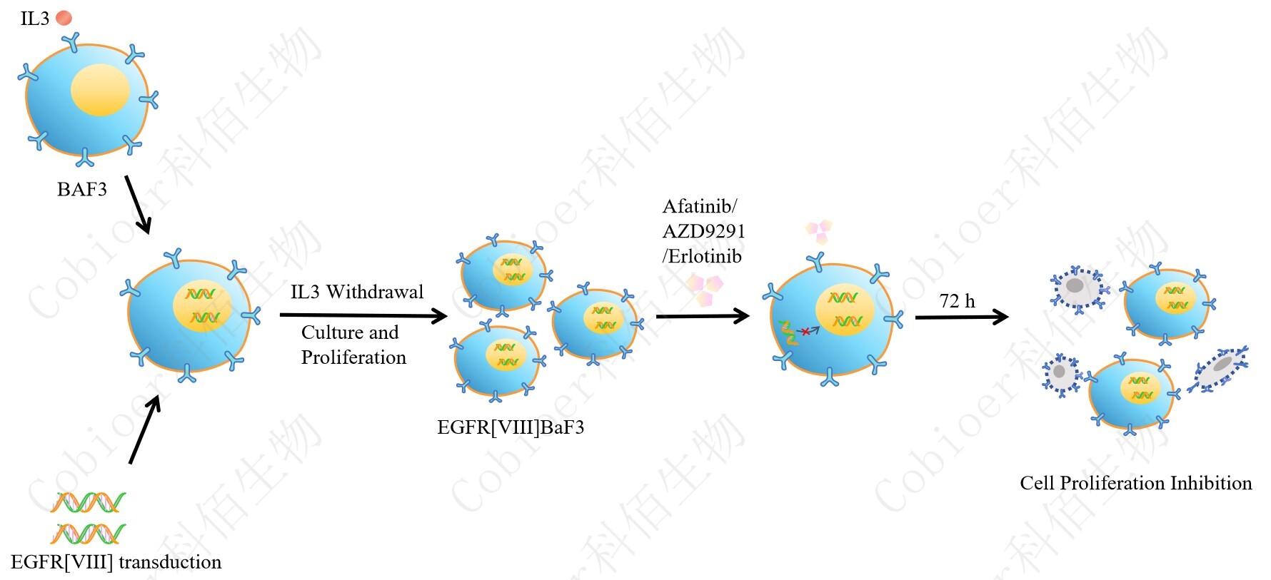 BaF3(小鼠原 B 細(xì)胞)的生長和增殖需要 IL-3 的維持。通過引入各種表達(dá)激酶的基因, 能作為 BaF3 的驅(qū)動(dòng)基因,讓 BaF3 不再依賴 IL-3 而增殖,進(jìn)而激酶基因成為 BaF3 增殖依 賴的驅(qū)動(dòng)基因,用于評估小分子藥物對激酶的靶向抑制作用,原理及流程見下圖所示。